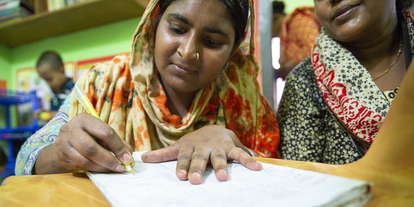 Fotos: Woman Signs Document, Aga Khan Bangladesh, Copyright Andy Aitchison | Children and mother reading, Petershof Duisburg, Copyright Andy Aitchison